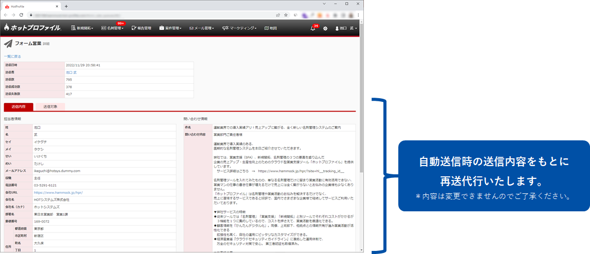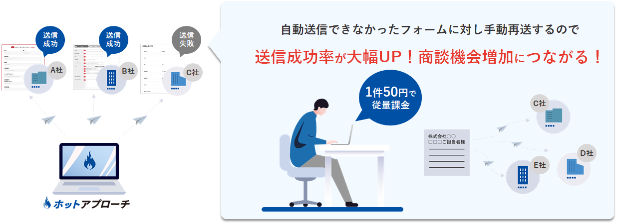 ホットアプローチのフォーム営業が自動送信できなかったお問い合わせフォームに対し、弊社スタッフが代わりに再送いたします。
