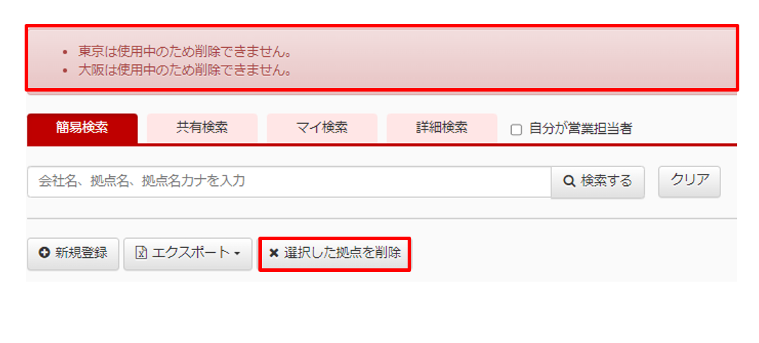 拠点を削除する場合、該当拠点に紐づく名刺やリード、報告、商談がある場合は削除ができません。