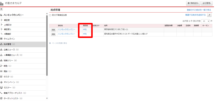 新しい本社の名刺を登録をしていない場合は、自動で拠点情報は作成されないため、お手数ですが、名刺登録または手動での拠点追加をお願いいたします。 - お客様カルテでの組織ツリーでは、旧新宿区の本社と、新名古屋市の本社が2つ並列され表示されます。