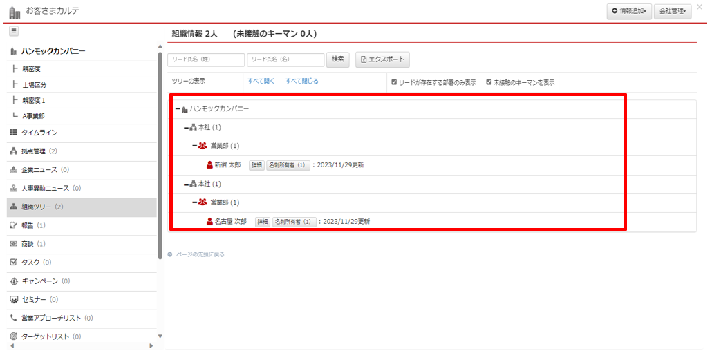 名刺登録をした場合は新たに組織ツリーは拠点名「本社」が登録されます。