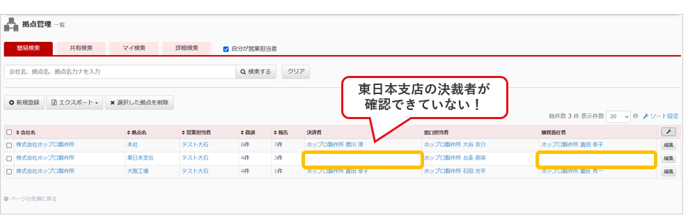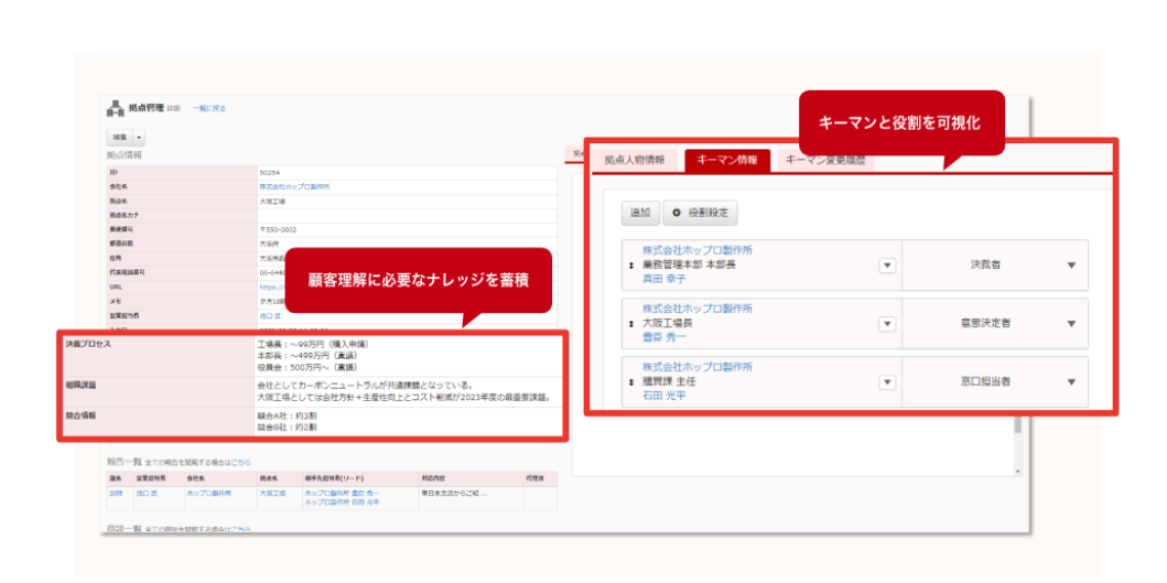 拠点ごとの決裁者を登録し、引継ぎの際や分析の際に確認することでスムーズな商談が可能になります。