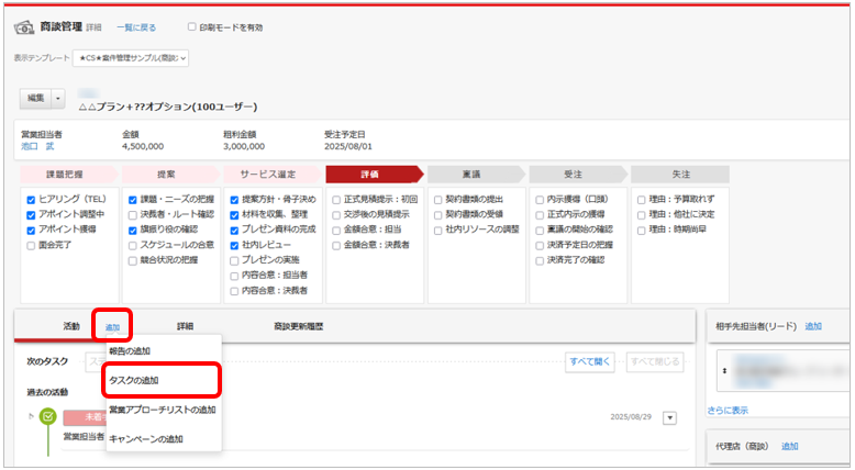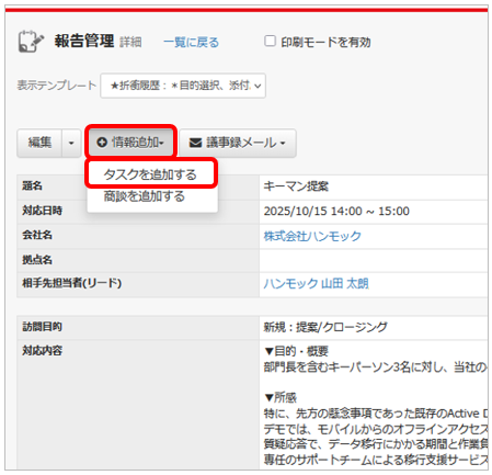 タスクは報告や商談に紐づけて登録することが可能です。