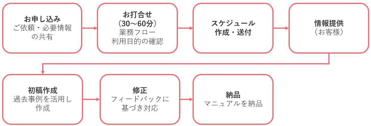 - お客様から提供いただいた情報に基づいてマニュアルを作成いたしますので、正確な情報提供をお願いいたします。