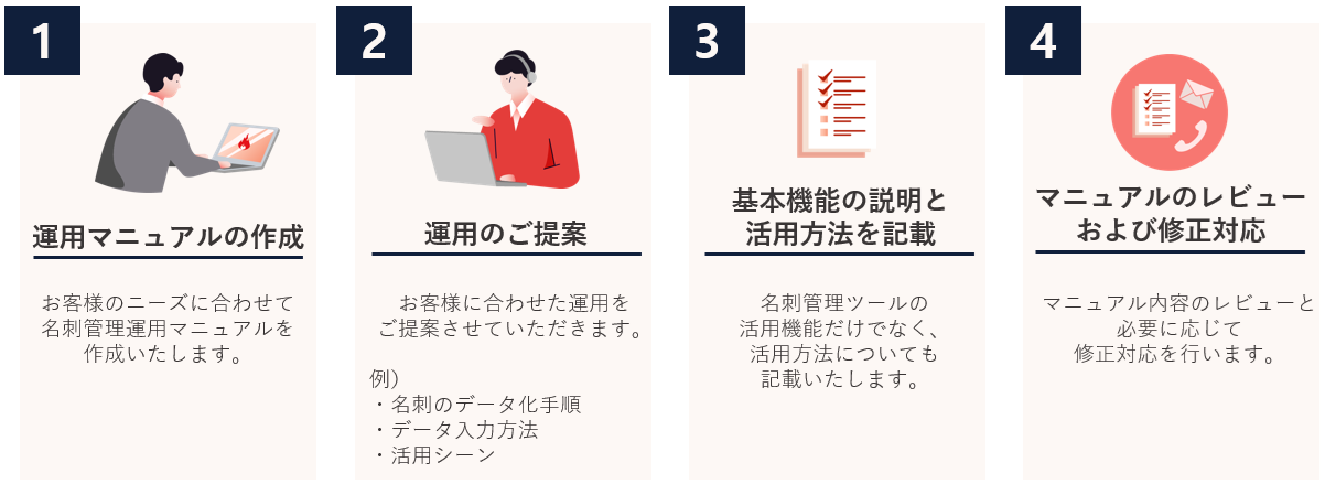 - 弊社が過去の導入事例やベストプラクティスを活用し、お客様の業務に合わせた運用マニュアルを作成する代行サービスです。
