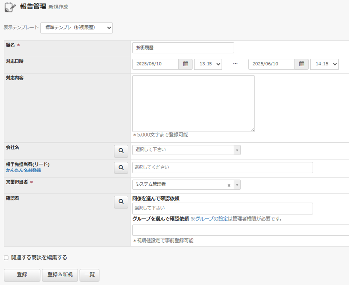 | 対応日時 | 顧客折衝の日時を設定します | 自動挿入 or 日付選択 |