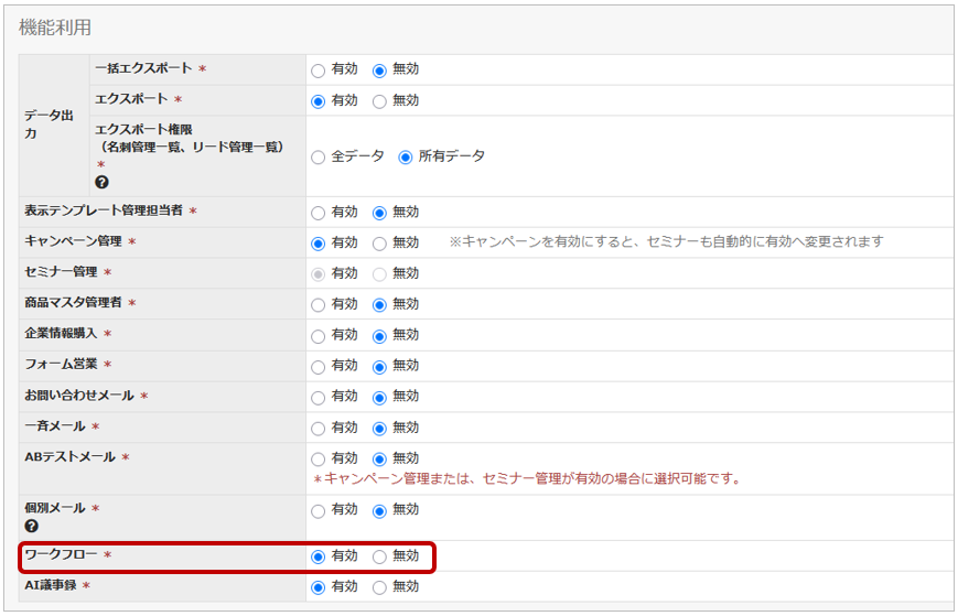 リードワークフロー機能を利用したいユーザーの設定で機能を有効化する必要があります。