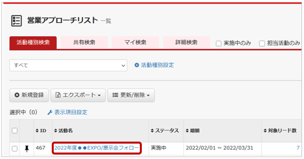 利用機能:キャンペーン管理 → 営業アプローチリスト