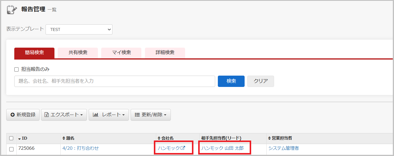 表示テンプレートにて報告管理一覧上で「会社名」「相手先担当者」を一覧表示することで