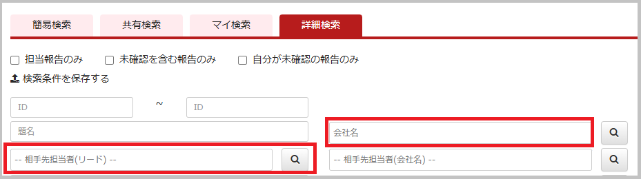 報告登録時に「会社名」「相手先担当者」を登録しておくことで、後から報告を検索した際に
