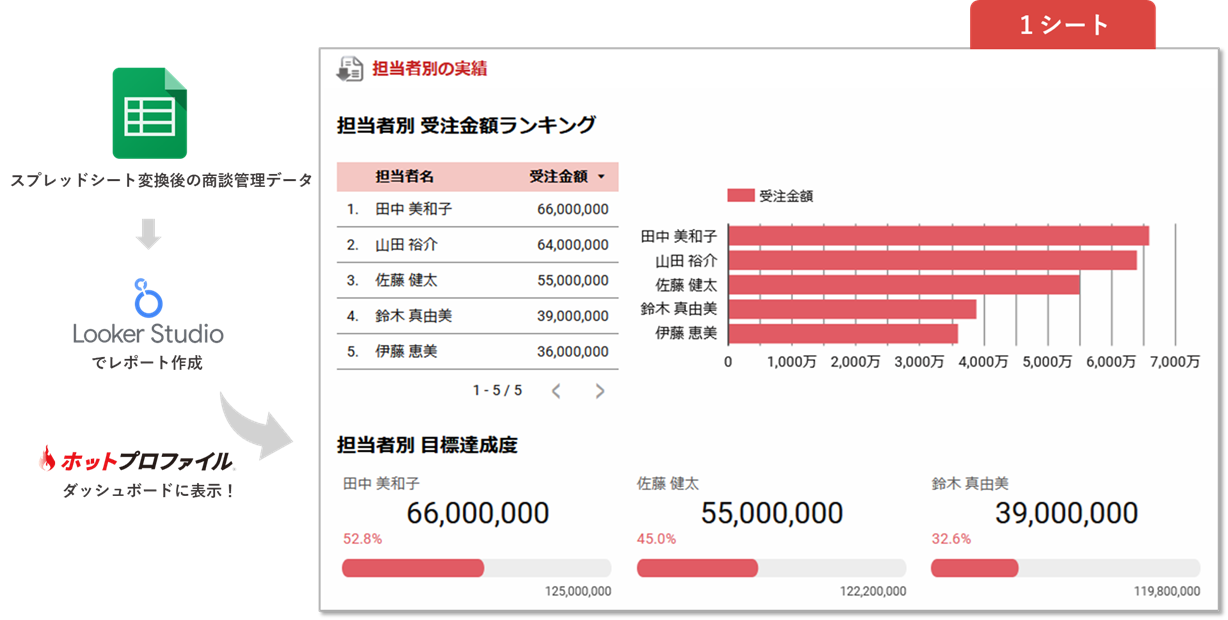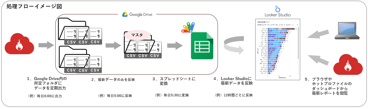 - Looker Studioよりスプレッドシート接続を行い、最新データを取り込み・加工・反映