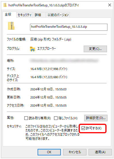 ※セキュリティ欄が表示されていない場合、本手順はスキップしてください。 - zipファイルを解凍し [ hotprofileTransferToolSetup.msi ] をダブルクリックし、