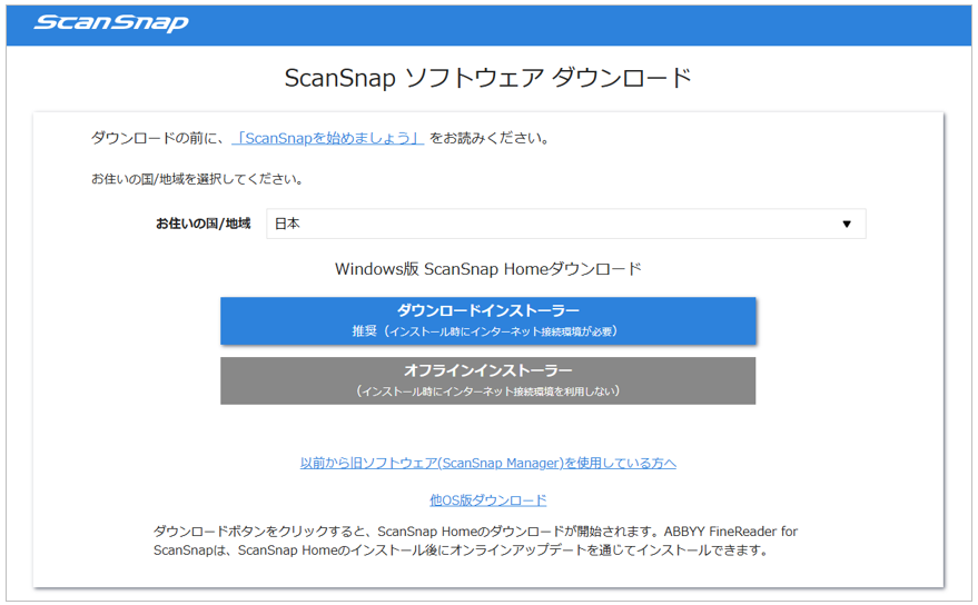 ※ScanSnapHome最新のバージョンをご利用ください。 - [ ダウンロードインストーラー ] をクリックします。
