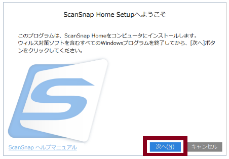 - 「ScanSnap Home Setupへようこそ」の画面が表示されたら [ 次へ ] ボタンをクリックします