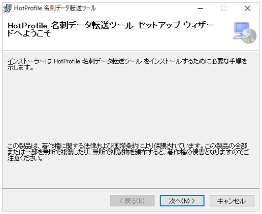 インストーラーを起動します。 - セットアップウィザードに従って、名刺データ転送ツールをインストールします。
