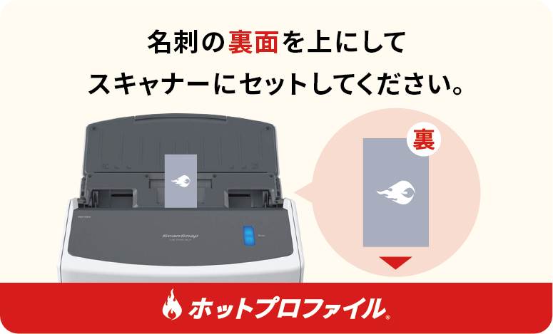 名刺をスキャンする際は、名刺のおもて面(会社名・氏名がある面)を上にしてスキャナーにセットしてください。
