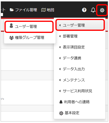 1. 画面右上 [ 歯車マーク ] - [ ユーザー管理 ] - [ ユーザー管理 ] をクリックします。