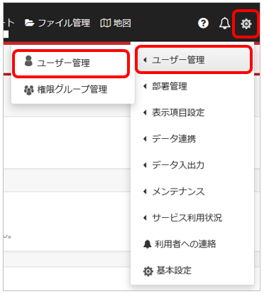1. 画面右上 [ 歯車マーク ] - [ ユーザー管理 ] - [ ユーザー管理 ] をクリックします。